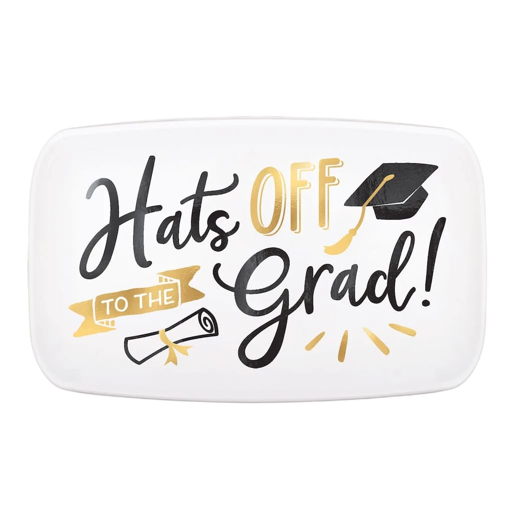 ConGRADulations graduate! You’ve finished one part of your life and you’re on to the next but don’t forget to celebrate with this festive rectangular coupe platter. Each white platter features a “Hats off to the grad” message in shiny fonts. Fill this sturdy plastic platter with the new graduate’s favorite foods.