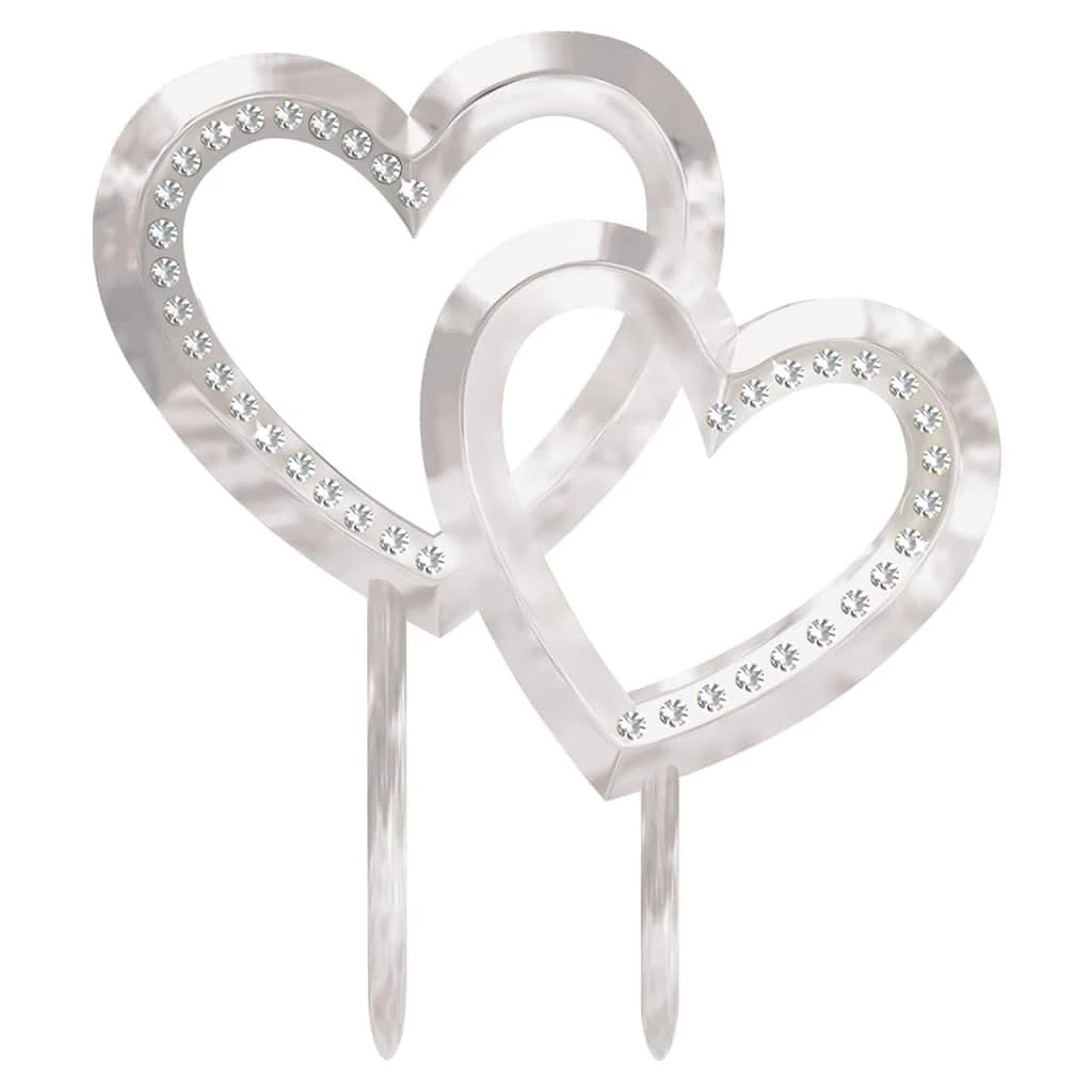 This silver electroplated plastic topper features two interlocking hearts with beveled edges and embossed dots on facing edges.