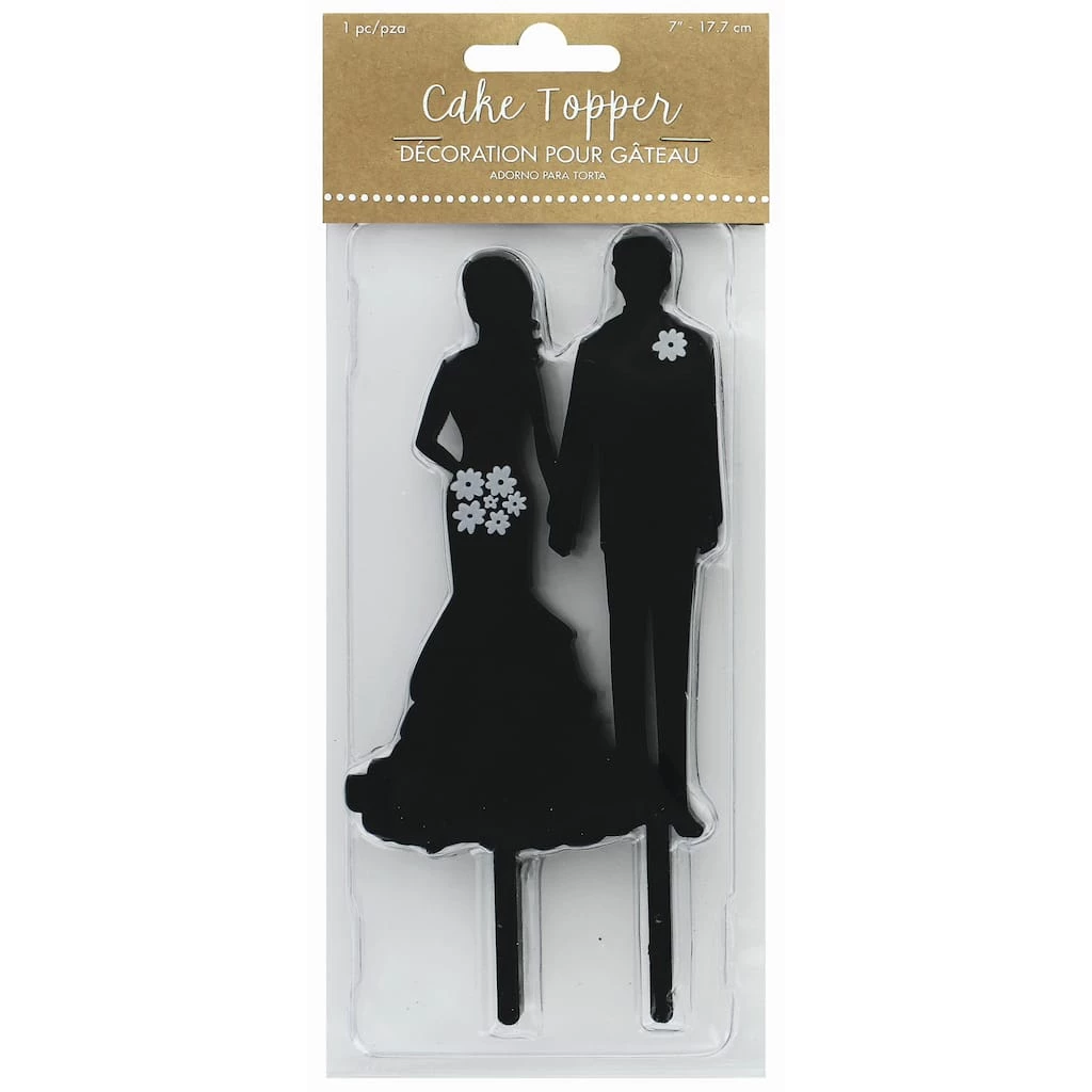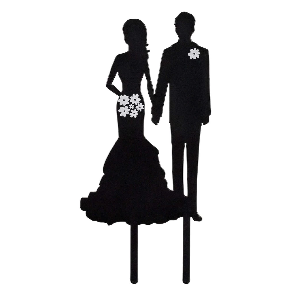 This lovely cake topper features a black silhouette cutout of a bride and groom with a white flower bouquet and boutonniere.