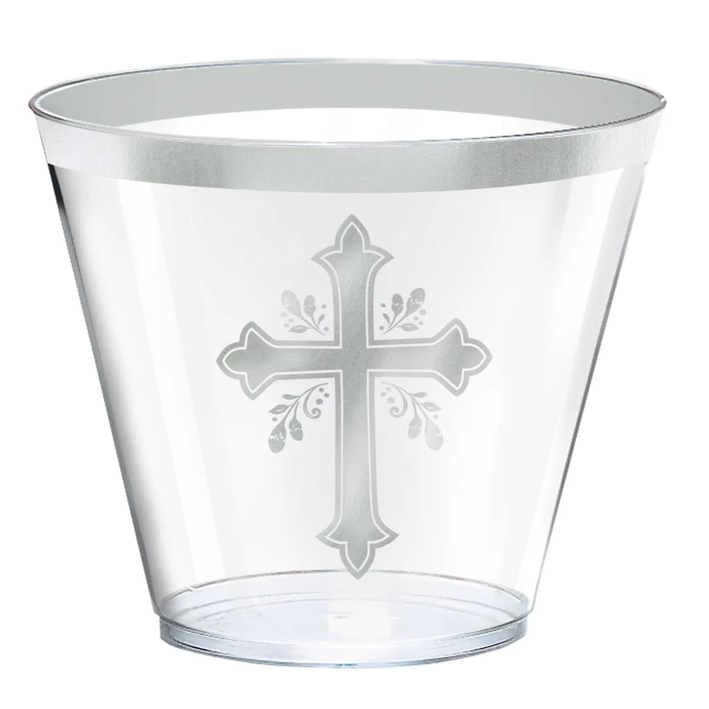 Celebrate your religious occasion with these Silver Cross Holy Day Plastic Tumblers. Each cup features a silver cross and a matching silver band. They are perfect for use during baptisms, communions, confirmations, or other religious celebrations.