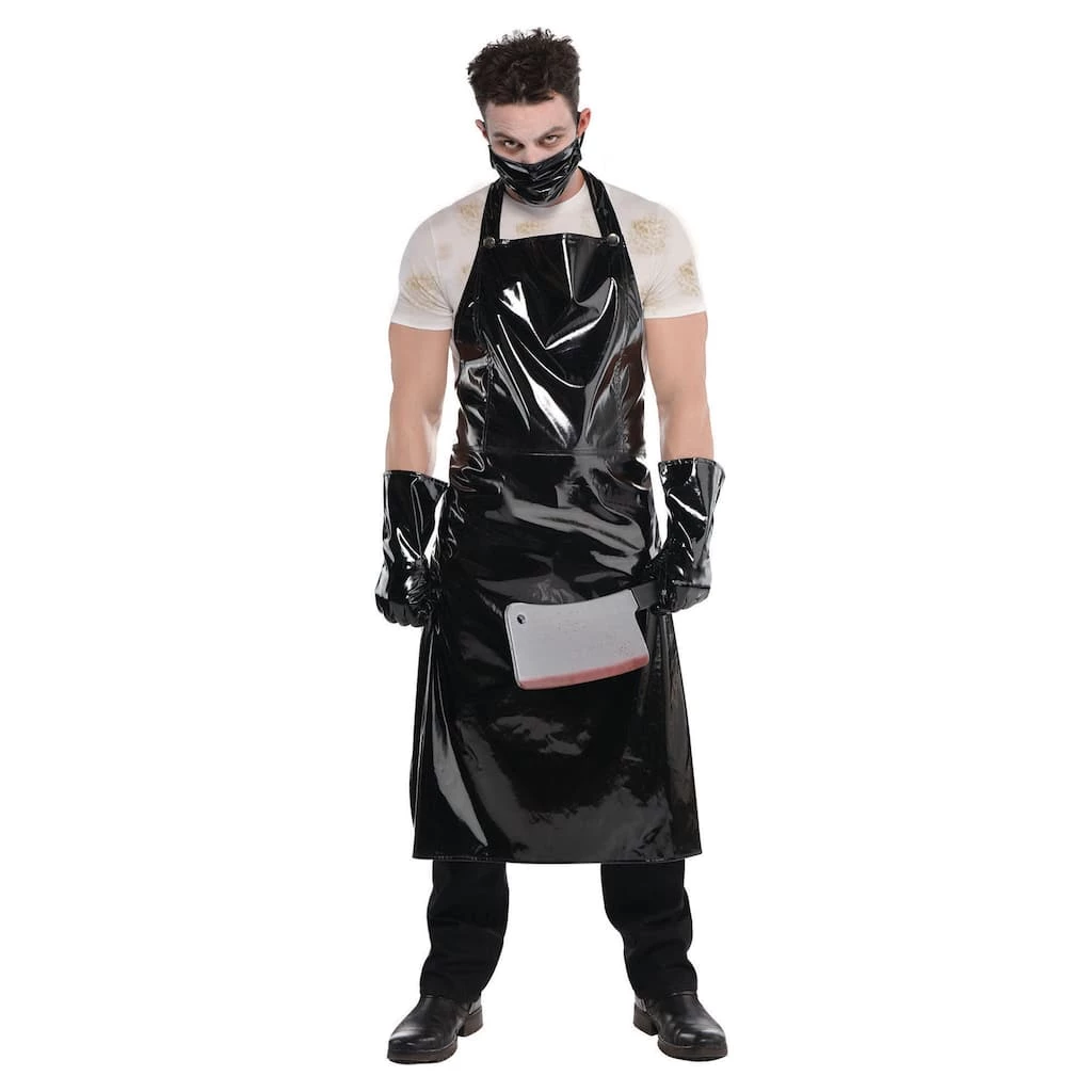 Serve up a prime cut of fear at your next costume party with this Butcher Accessory Kit. Made of shiny faux-leather this kit is sure to get a scream or two. Pair with a prop knife for maximum horror (not included).