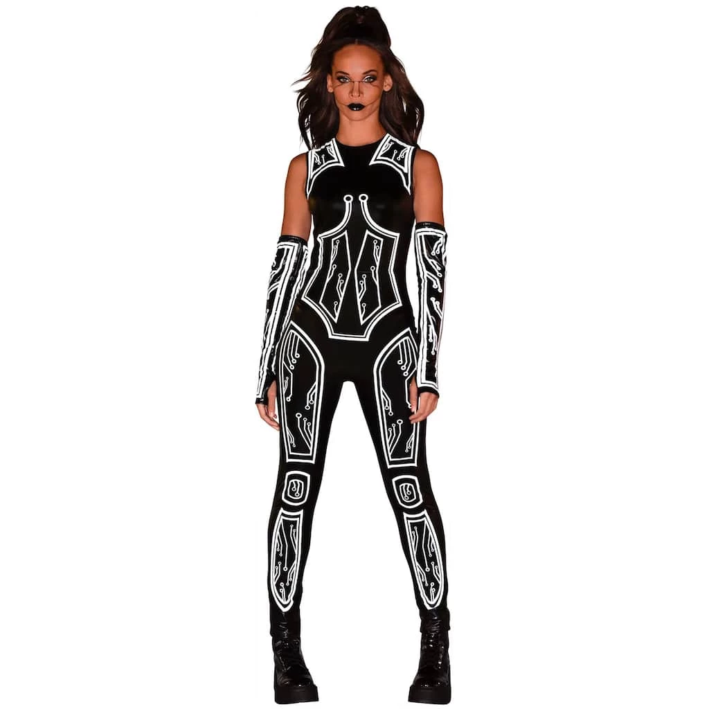 Get ready to conquer cyberspace with this Cyberpunk Catsuit. This futuristic outfit features a bodysuit with matching armbands. Shoes not included.