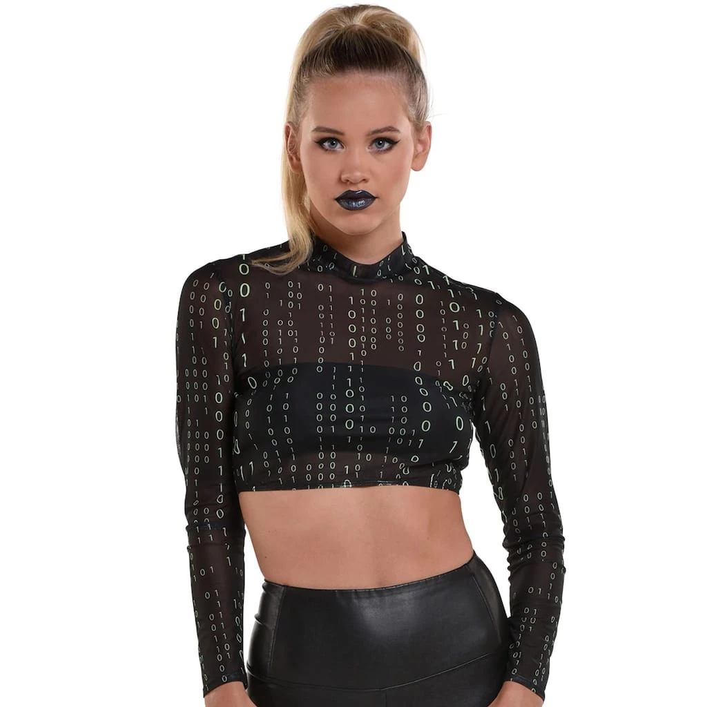 Get ready to conquer cyberspace with this Cyberspace Mesh Top. This top is lined with binary code and will prepare you for the digital era. Pants and makeup not included.