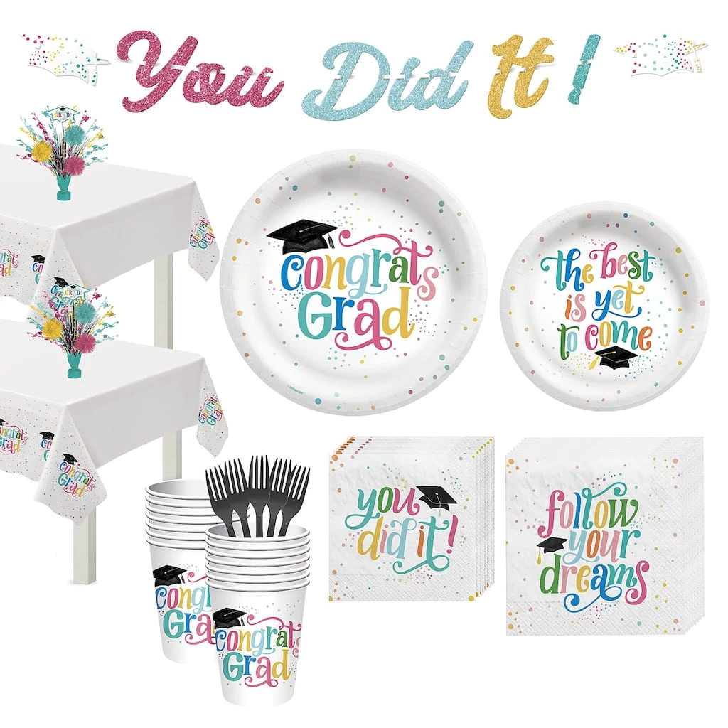 Celebrate your graduation with this Follow Your Dreams Tableware kit for 40 guests. This all-inclusive kit features everything you need to host the graduation party of your dreams. These plates, napkins, cups, and table cover feature colorful messages and matching polka dots. Finish off the look with the glittery “You Did It” banner and colorful tinsel centerpiece.