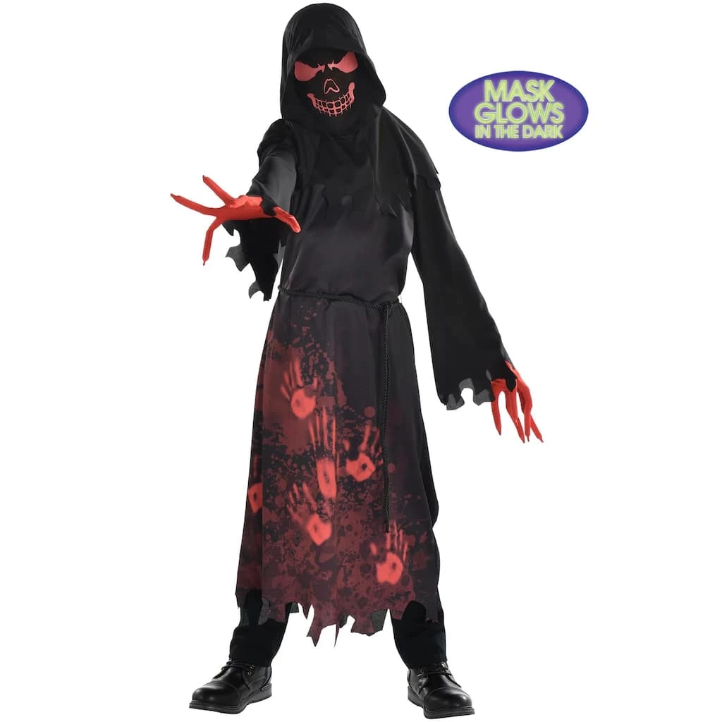 - Includes glow in the dark mask with attached hood, robe, long fingered gloves, and rope belt