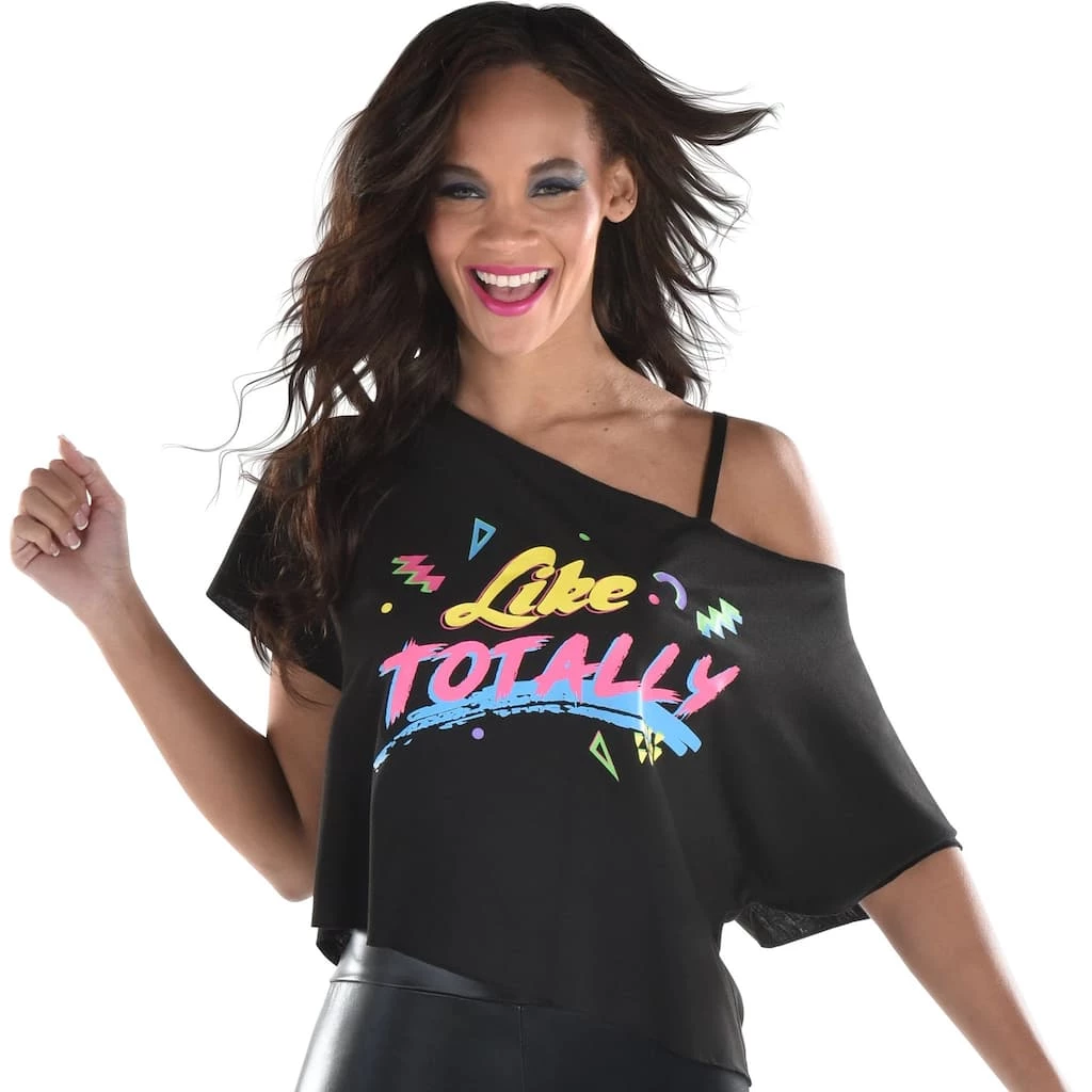 Prepare for the party of the decade with this Off Shoulder Graphic Tee Crop Top. This stylish top reads ”Like Totally” in colorful font and features a flirty off the shoulder look.