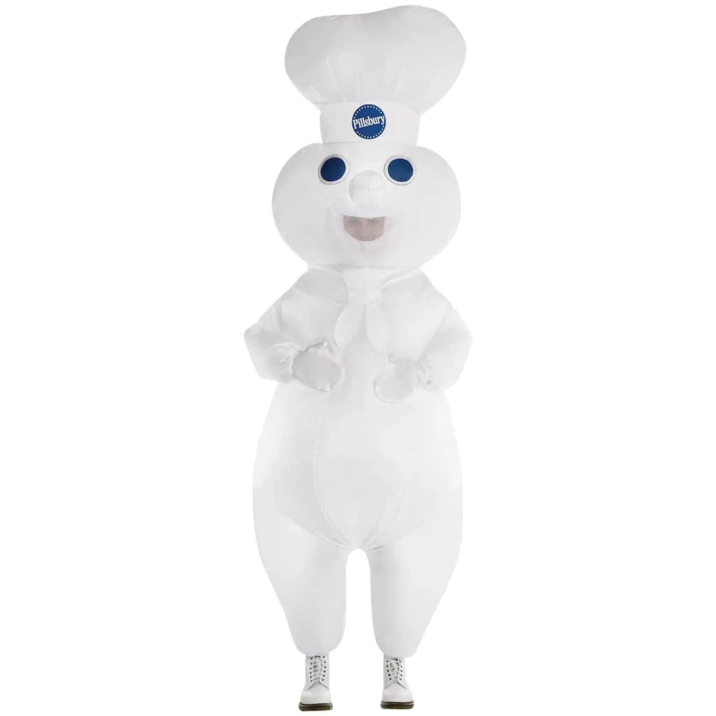 Cook up something delicious with this Pillsbury Doughboy Inflatable Costume. This classic costume features an inflatable jumpsuit with battery operated fan that inflated to become a large, puffy, dough man.Β