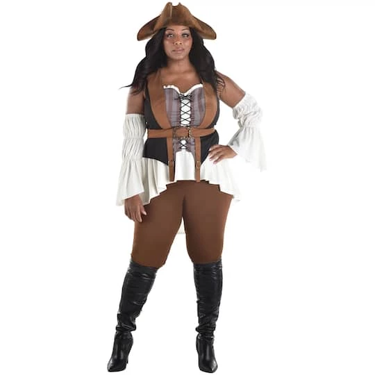 Watch out lest ye get your booty plundered with this Shipwrecked costume. This adventurous costume features a body forming catsuit with attached lace up vest and shirt, matching sleevelettes, and a classic pirate hat. Boots not included.