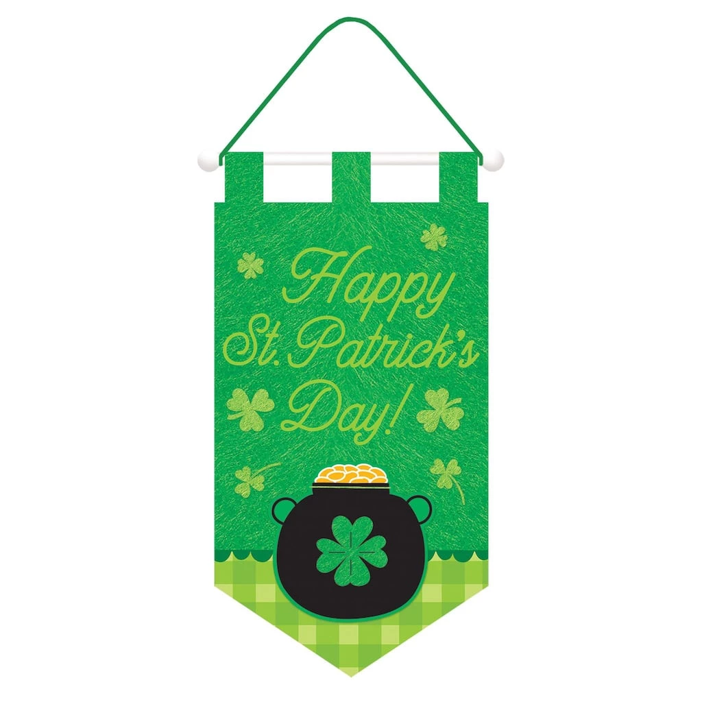 Bring the luck of the Irish to your house with this St. Patrick’s Day felt door banner. This fun and festive banner features the message “Happy St. Patrick’s Day” above a pot of gold and shamrocks. Use the included bar and rope hanger to hang this banner indoors or out.