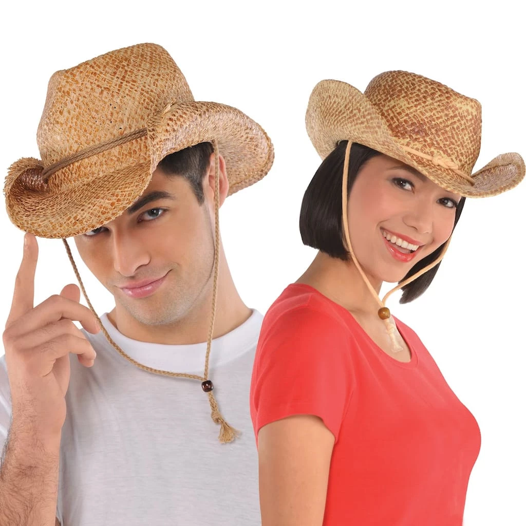 Yee haw! Have the best cowboy costume around with this Straw Cowboy Hat. This sturdy hat looks like tightly woven straw and will securely stay on your head thanks to the attached chin strap.Β When your Halloween costumes needs a little something extra, add a hat!