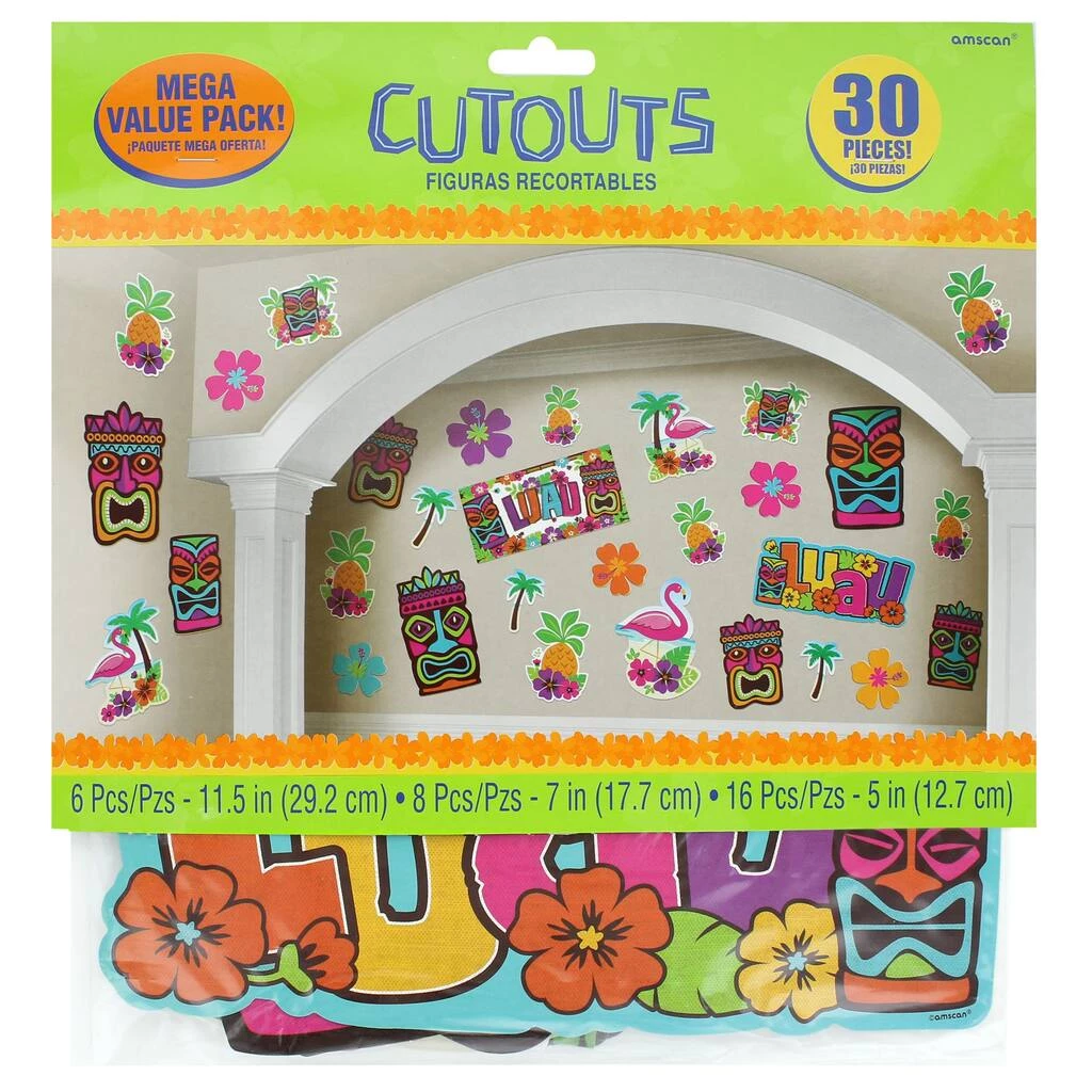 These double-sided plastic cutouts feature tiki statues with different facial expressions, pineapples, flamingos, palm trees and the caption, “Luau.”