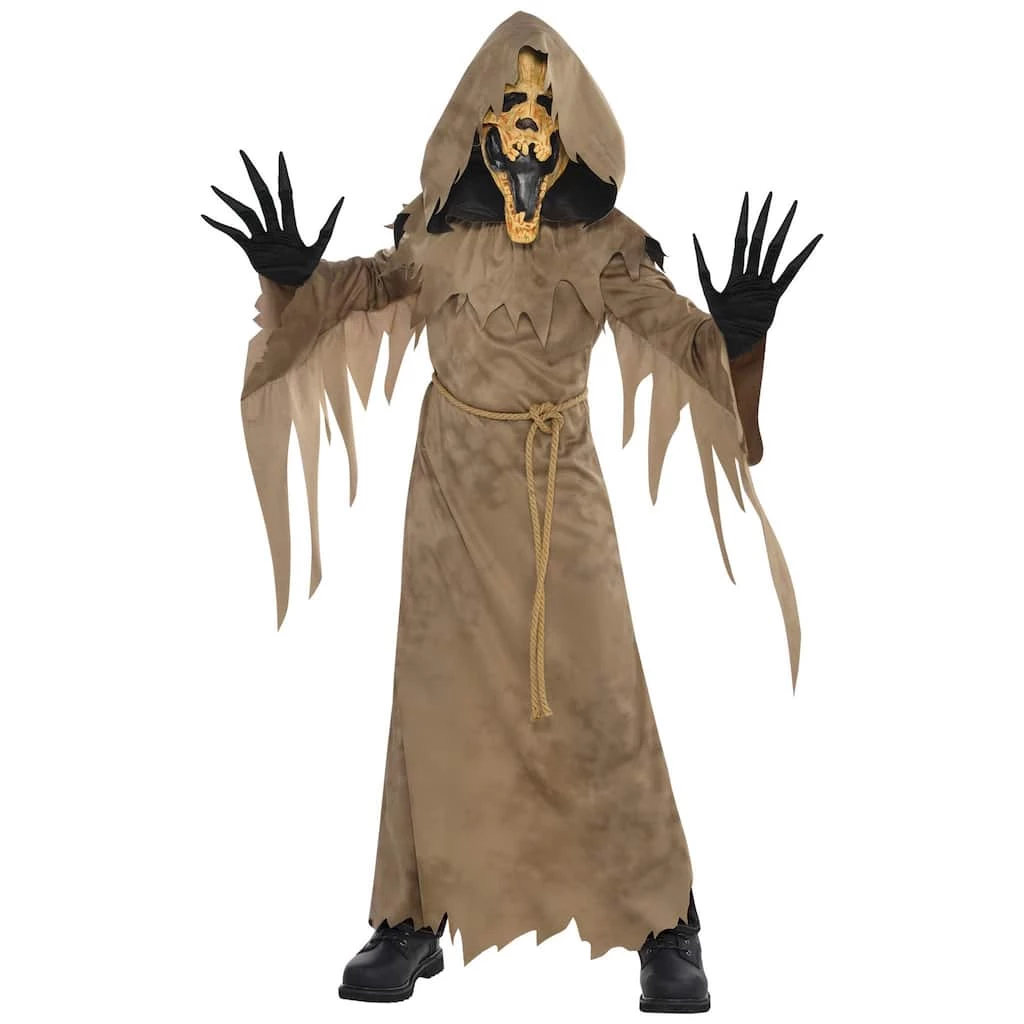 Terrify the swamps and the neighborhood with our Swamp Creeper Costume. Your kids will love having the scariest costume on the block, especially if it scares people into giving them more candy. This spooky creature costume features a tan robe with large attached collar and hood, rope belt, and gloves that make your child’s hand look worn to the bone– literally. Complete the look with the terrifying and deformed-looking face mask and your child will be ready to trick-or-treat.